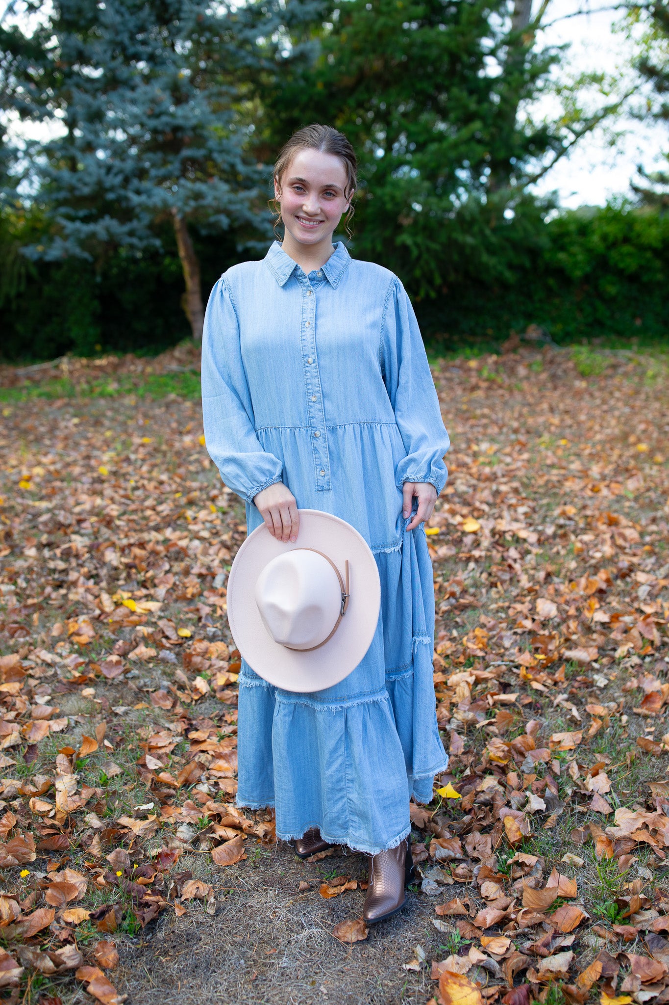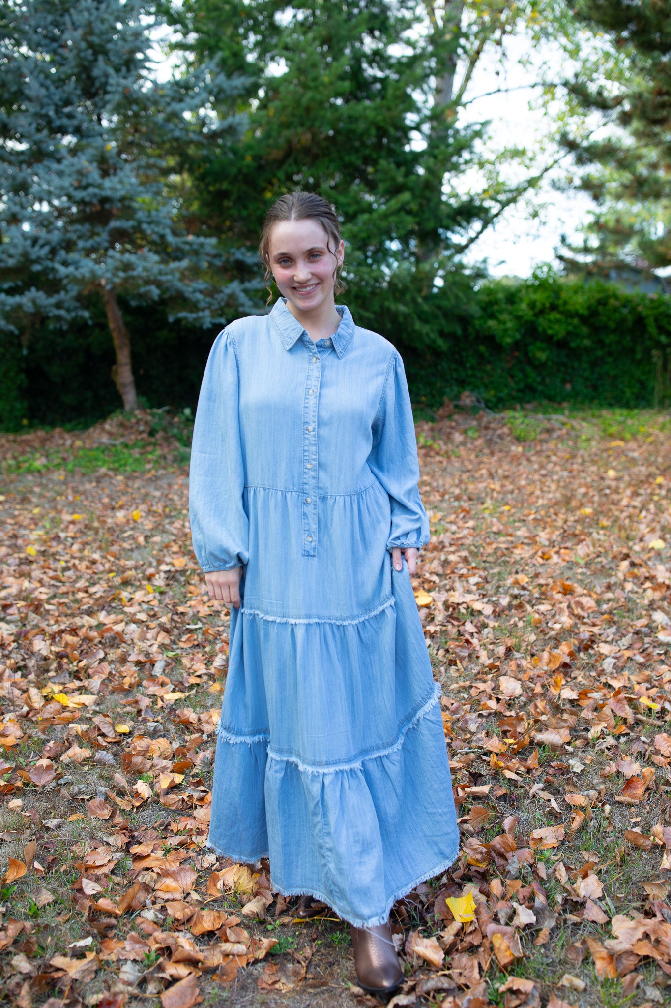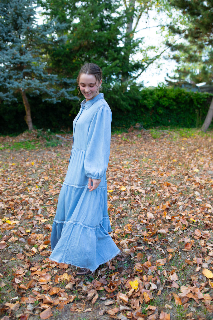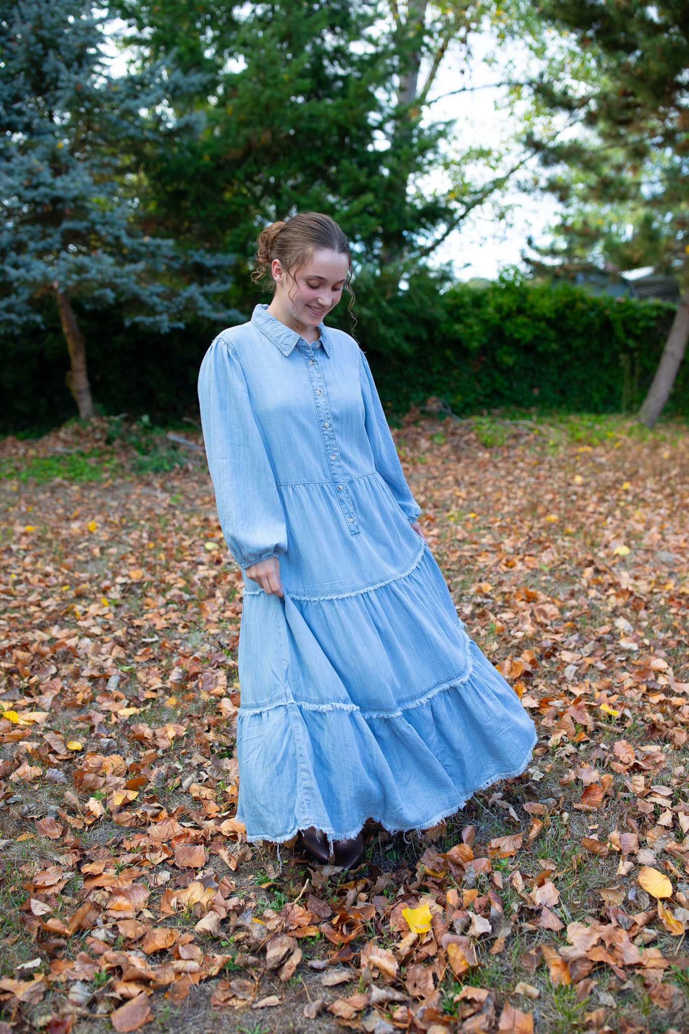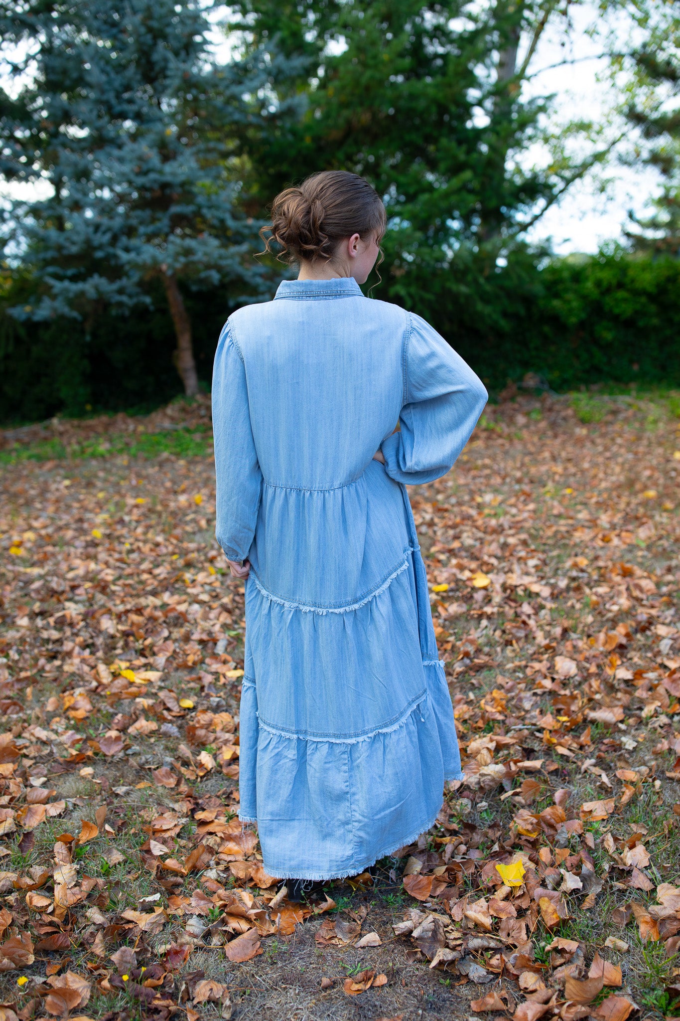 Effortless and timeless, this denim dress is designed with comfort and style in mind. Featuring a classic collared neckline, button-down front, and long sleeves, it’s perfect for all-day wear. The frayed tiered design adds a touch of texture and flow, giving it an easy, relaxed silhouette you’ll love. Lightweight, breathable, and versatile—this dress is a must-have piece for year-round wear.