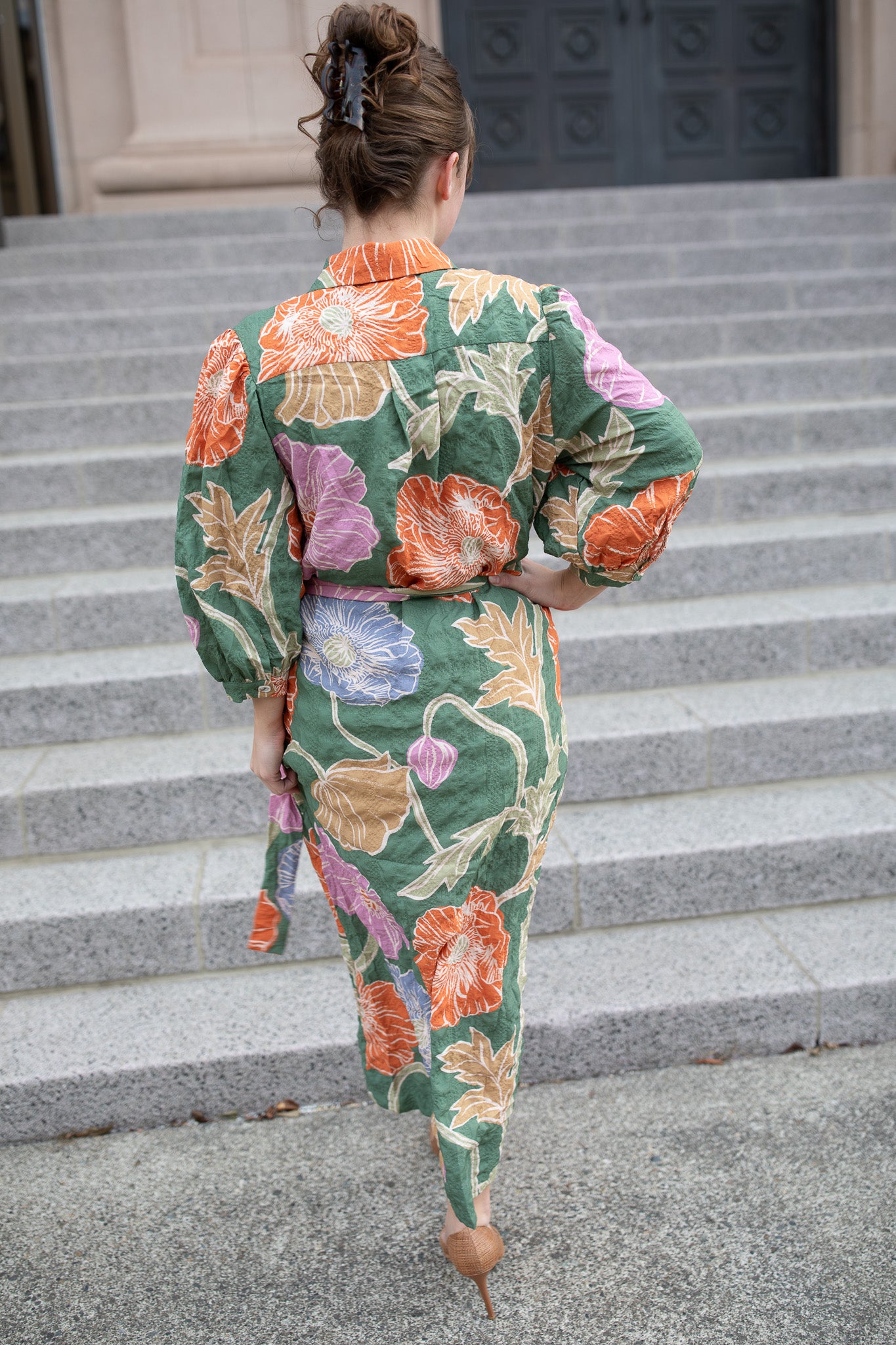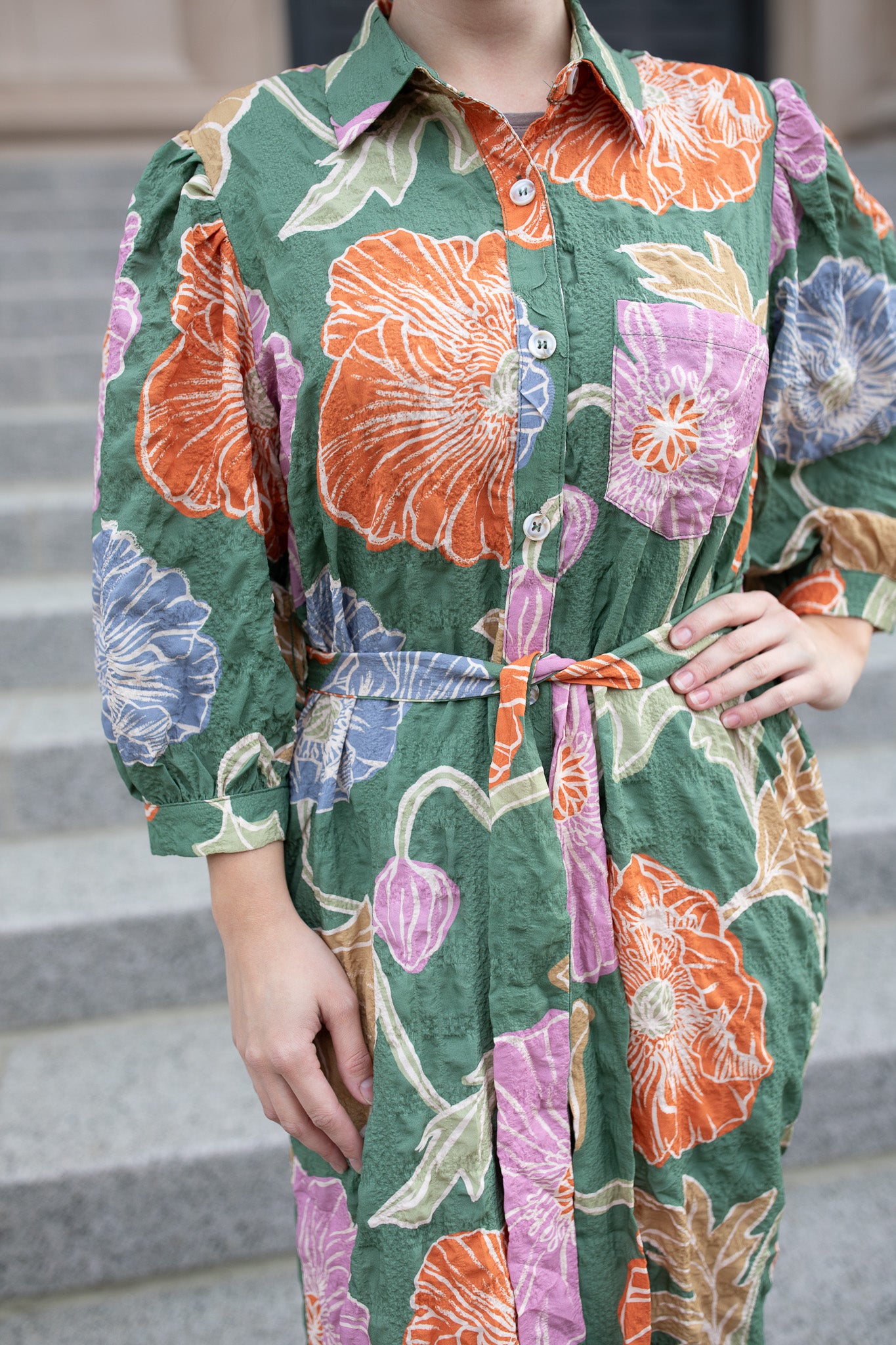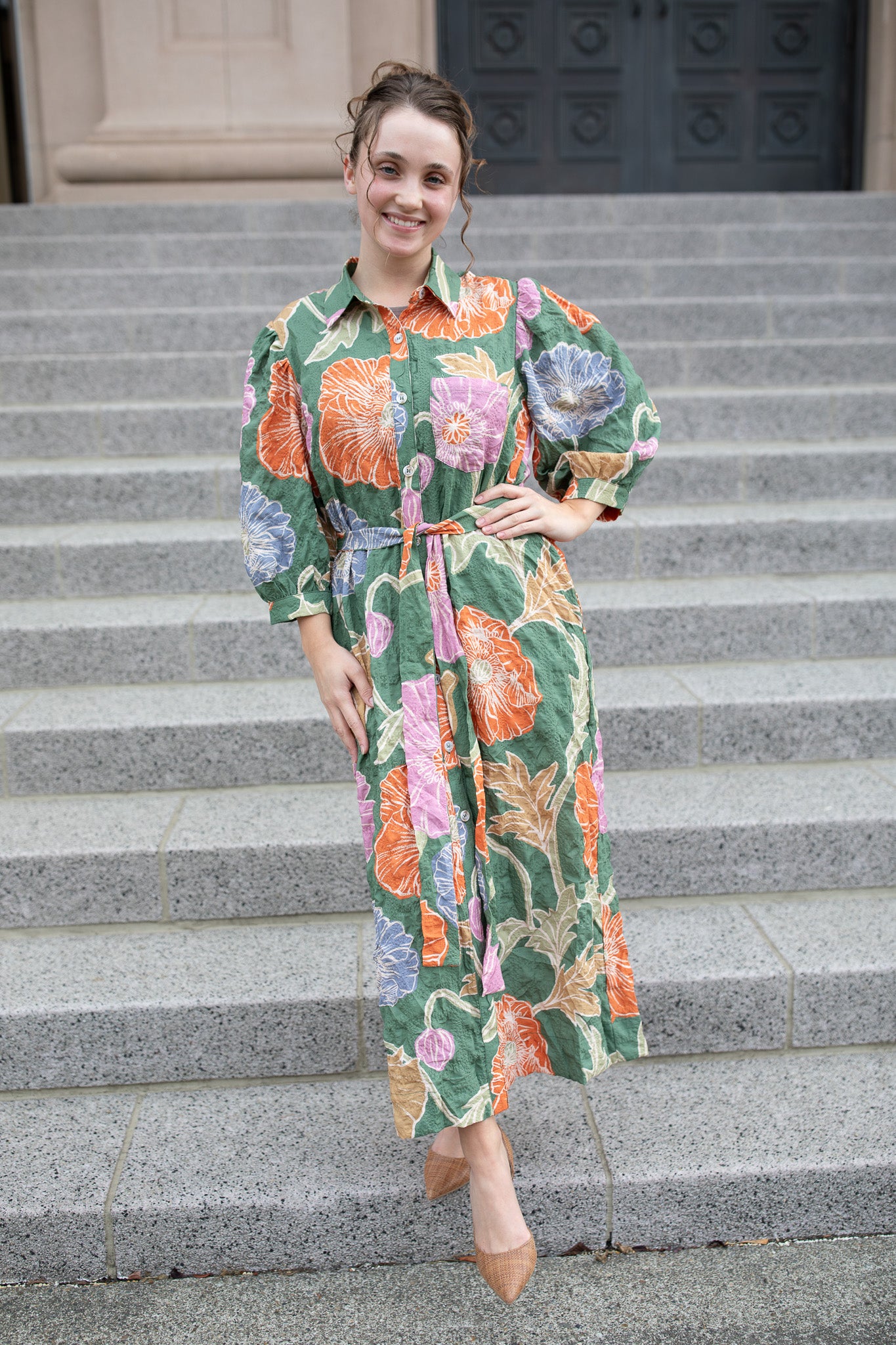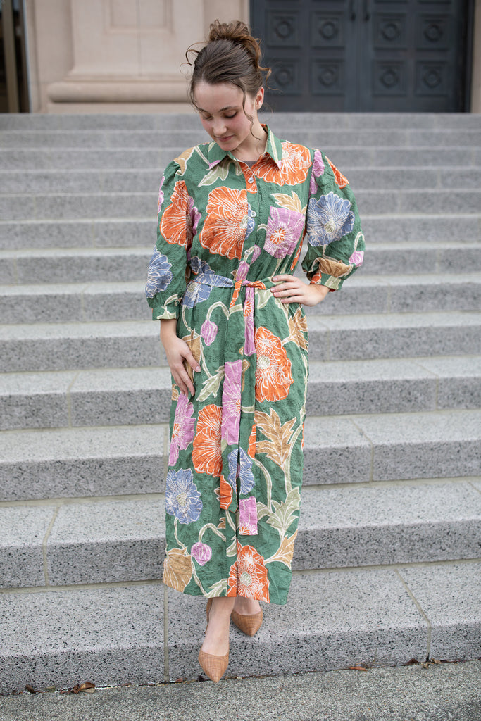 Effortlessly elegant and full of charm, this floral button-down dress brings texture and movement to your wardrobe. Featuring a belted waist for a flattering fit, puff sleeves for a feminine touch, and a soft textured fabric that adds depth to the vibrant print — it’s perfect for any season. Style it with heels or boots for a timeless, sophisticated look that transitions beautifully from day to night.